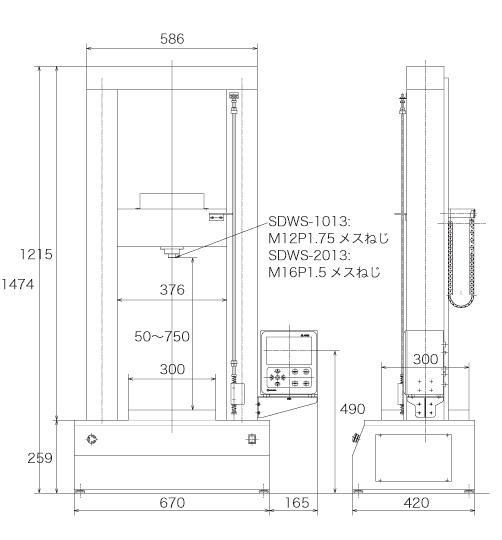 ■標(biāo)準(zhǔn)規(guī)格| 型號 * 1 | SDWS-0213-□ | SDWS-0513-□ | SDWS-1013-□ | SDWS-2013-□ | | 最大負(fù)荷 | 2kN | 5kN | 10kN | 20kN | | 負(fù)荷顯示 | 請參閱“負(fù)載范圍規(guī)格”表請參閱 “按型號劃分的負(fù)載范圍組合表” | | 最小單位 | | 負(fù)載精度 | JIS 1級試驗(yàn)機(jī)(測量指令值的±1%以內(nèi)) | | 最小排量單位 | 0.01毫米 | | 驅(qū)動(dòng)系統(tǒng) | 交流伺服電機(jī) | | 速度范圍 | 0.1-500mm /分鐘 | 0.05-100mm /分鐘 | | 工作臺(tái)到稱重傳感器的距離 | 最大750mm(有效行程取決于夾具的選擇) | | 有效測試寬度 | 376毫米 | | 工作臺(tái)尺寸 | 300 x 300 mm帶T形凹槽 | | 安全設(shè)備 | 任意設(shè)定上下限開關(guān),過載自動(dòng)停止 | | 有用的功能 | 測試條件內(nèi)部存儲(chǔ)器保持功能 峰值/谷值保持功能 循環(huán)操作功能 斷點(diǎn)檢測功能 起點(diǎn)檢測功能 自動(dòng)取消/自動(dòng)進(jìn)給功能 自動(dòng)原點(diǎn)返回功能 結(jié)果通過/失敗判斷功能 | | 外部輸出* 2 | USB | | 電源供應(yīng) | AC100V 10A | | 體重 | 約130kg | 約180kg | | 外形尺寸 | 寬770 x深390 x高356毫米(圖紙顯示) | W835×D420×H1474mm(圖紙顯示) | * 1在□欄中輸入載荷符號模型。請參照“各型號的負(fù)荷范圍組合表”。 * 2可以添加用于模擬或打印機(jī)的可選外部輸出。